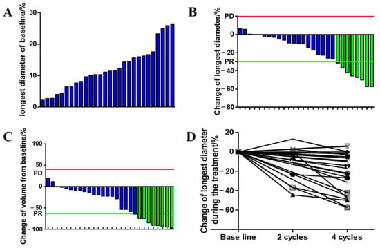 Changes in tumor size are shown in Figure 1. Radiographical evaluations showed that the longest diameter with respect to the tumors was reduced in 24 patients (median of 19.36%: from 0.11% to 57.34%) and was increased in 3 patients. According to the measurement results from Mimics 20.0, 25 patients had a tumor volume decrease (median of 28.64% and range from 1.63% to 97.56%) and 2 patients had an increase in volume; in particular, the volume reduction in two patients was beyond 90%. However, the tumor response evaluated with respect to volume was consistent with the RECIST 1.1 criteria, although one patient had a decrease in volume but an opposite change with respect to tumor diameter.