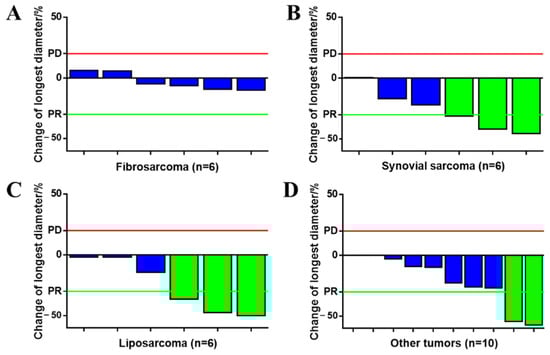 Tumor response of different pathological subtypes. (A) Fibrosarcoma (n = 6); (B) synovial sarcoma (n = 6); (C) liposarcoma (n = 6); (D) other sarcomas (n = 10). Blue: tumor response exhibits stable disease. Green: tumor response exhibits partial responses.