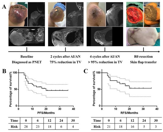 Long-term survival of patients treated with AN/AI. (A) Tumor response of the patient with PNET: the reduction in TV was beyond 95%. Up until now, the patient received R0 resections with an RFS of 19 months. (B) PFS of all 28 patients; (C) RFS of 21 patients who received surgery. PNET, primitive neuroectodermal tumor. TV, tumor volume. AI/AN, adriamycin and ifosfamide combined with anlotinib. PFS: progression-free survival; RFS: relapse-free survival.