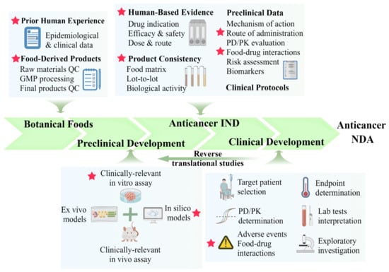 Stepwise development pipeline of botanical foods as anticancer medicines. Abbreviations: QC, quality control; GMP, good manufacturing practices; PD/PK, pharmacodynamics/pharmacokinetics; IND, investigational new drug; NDA, new drug application. Pentagrams label the unique steps that applied to botanical food development compared to conventional drug development (the figure is prepared with Figdraw, https://www.figdraw.com, accessed on 10 January 2023).