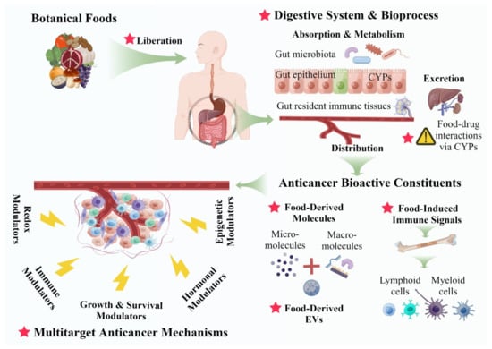 Although some health care providers are enthusiastic about using plant foods as cancer therapy from the limited data obtained in in vitro, in vivo, and in silico approaches, most require much more knowledge of the mechanisms of action of these agents. Before designing preclinical and clinical studies, it is important to be aware of the unique physiological and pharmacological processes that take place in the human body when consuming botanical foods or related products compared to the processes involved in consuming conventional single-agent synthetic drugs. Figure 2 illustrates how botanical food products (whole foods, food extracts, and mixtures taken as dietary supplements) are liberated via oral consumption and are subsequently digested in digestive organs after oral consumption. The gastrointestinal tract, particularly the small intestine, plays a central role in processing food products, where bioavailable chemical constituents are absorbed and metabolized by intestinal epithelia [,]. Afterward, the bioactive molecules are transported by the bloodstream to target organs, where the bioactive constituents exert their anticancer effects once it is delivered to cancer tissues/cells