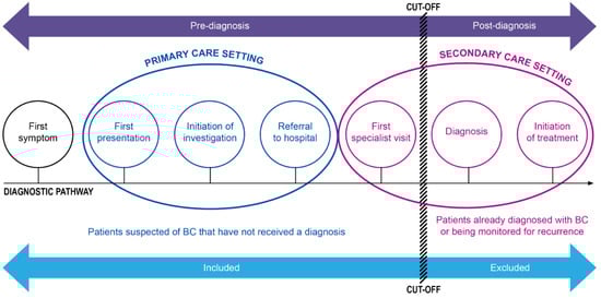 This review was informed by the CanTest Framework, a 5-phase translational pathway for diagnostic tests, from new test discovery to health system implementation in low-prevalence populations [17]. Only studies providing measures of diagnostic accuracy beyond discovery/development (that is, Phase 2 and beyond of this framework) were included (Figure S2 in Supplementary Materials). As papers were set in different healthcare systems and settings, a diagram was developed to guide decisions on inclusion (adapted from Olesen et al. 2009) [18], using a cut-off point/boundary in the diagnostic pathway of a typical cancer patient. Studies were included up to the point where patients were referred for a first specialist visit but not diagnosed (see Figure 1).