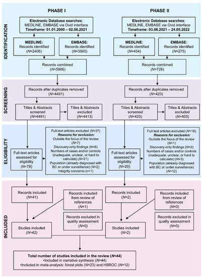 Electronic database searches retrieved 6638 records, of which, following deduplication, title and abstract screening, 98 were assessed in full text for eligibility. Fifty-five records were excluded for either being outside the focus of the review (N = 8) or reporting on: (i). discovery-only findings (N = 8); (ii). numbers of cancer/non-cancer cases that were inadequate, unclear, or not possible to calculate (N = 24); (iii). populations already diagnosed with bladder cancer or under surveillance for bladder cancer recurrence (N = 14). One study was excluded due to integrity concerns (N = 1). One additional record was added, following the manual searching of reference lists of included studies, leading to a final sample of 44 studies included in the review (Figure 2). No studies were excluded during quality assessment.