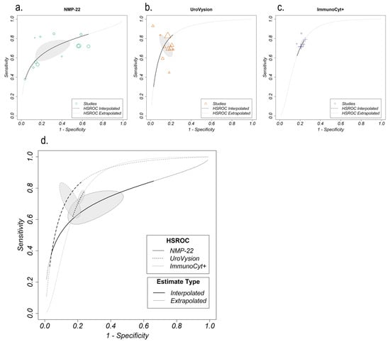 The performance of NMP-22 was reported for two different platforms, ELISA (N = 10) and BladderChek (N = 3). In a sensitivity analysis (Figure S5 in Supplementary Materials), the performance of NMP-22 across both platforms was compared to the performance for ELISA only (there were insufficient BladderChek studies (n < 5) for a separate HSROC analysis). Although the three BladderChek studies all report relatively high specificities (0.81–0.96)—compared to the ELISA studies (0.34–0.88)—the reported sensitivities are variable (0.26–0.76); the HSROC analysis finds only minimal differences in discrimination between the ELISA-only studies and all NMP-22 studies (adjusted partial AUC of 0.701 and 0.689 respectively).