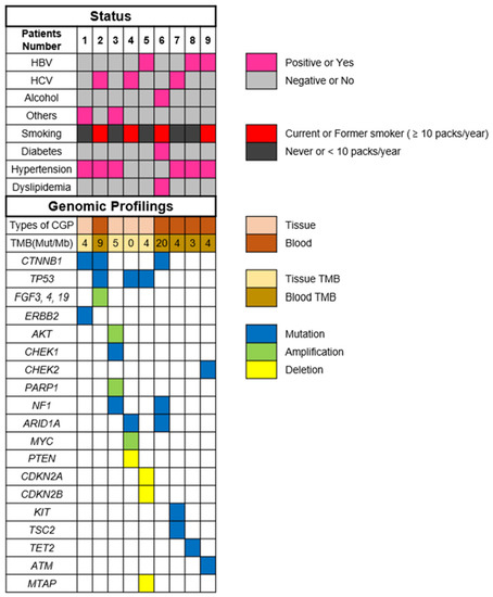 | Patients Number, Age, Sex | Etiology | Number of Prior Systemic Therapies | Metastatic Spread | CGP Method (Organ) | Mutations (VAF%) |