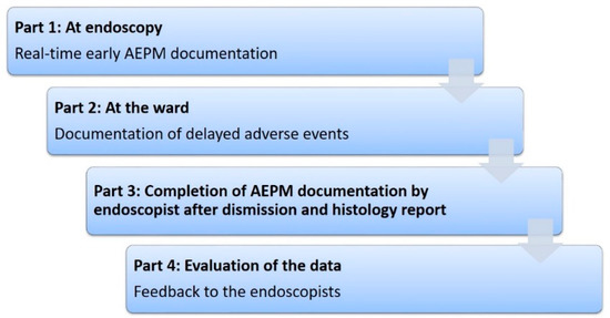Process flow of AEPM monitoring. The AEPM form is a mandatory part of the endoscopic report and the medical record. It is processed in three steps: at endoscopy, on the ward after discharge of the patient, and, finally, by the endoscopist after evaluation of the patient’s clinical course.