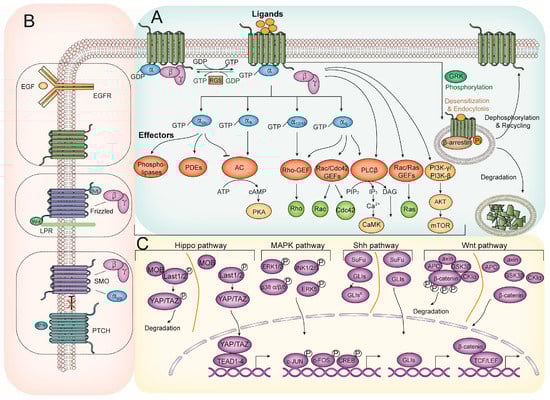 GPCR signaling and its crosstalk with other signaling pathways. (A) The most common GPCR-related signaling pathways. Agonist-stimulated GPCRs undergo a conformational change and facilitate the dissociation of Gα/Gβγ heterotrimer by replacing GDP with GTP on the Gα subunit. Subsequently, Ga and Gβγ trigger several downstream effectors, including secondary messenger systems, GEFs, Rho, and Ras GTPases, leading to a wide range of biological regulation. Besides the regulators of the G protein, signaling proteins (RGS proteins) promote the heteromeric complex reassociation and the signaling termination by accelerating intrinsic GTPase activity. Notably, agonist-activated GPCRs are also phosphorylated by GRKs and interact with β-arrestin, resulting in signaling desensitization and GPCR endocytosis. The endocytic β-arrestin-GPCR complex can be modulated by multiple factors and undergo degradation or recycling. (B) GPCR-associated crosstalk on the membrane and GPCR-EGFR crosstalk contain EGFR ligand-dependent transactivation and EGFR ligand-independent transactivation. The following pathways are the Wnt and Shh pathways. (C) The main pathways targeted by the multiple effectors in (a) consist of the following signaling pathways: Hippo pathway, MAPK pathway, Shh pathway, and Wnt pathway. Abbreviations: AC, adenylyl cyclase; AKT, protein kinase B; CREB, cAMP response element-binding protein; EGF, epidermal growth factor; EGFR, EGF receptor; ERK, extracellular signal-regulated kinase; GEF, guanine exchange factor; GLI, glioma-associated oncogenes; GPCR, G protein-coupled receptor; GRK, G protein-coupled receptor kinase; JNK, c-jun N-terminal kinase; LATS, large tumor suppressor kinase; MAPK, mitogen-activated protein kinase; mTOR, mammalian target of rapamycin; PDEs, phosphodiesterases; PI3K, phosphatidylinositol-3-kinase; PKA, Protein Kinase A; PLCβ, Phospholipase C β; ROCK, Rho-associated protein kinase; Shh, sonic hedgehog protein; SMO, Smoothened protein; SuFu, suppressor of fused; TAZ, transcriptional coactivator with PDZ-binding motif; TCF/LEF, T-cell factor/lymphoid enhancer factor; TEAD, transcriptional enhanced associate domain; YAP, yes-associated protein.