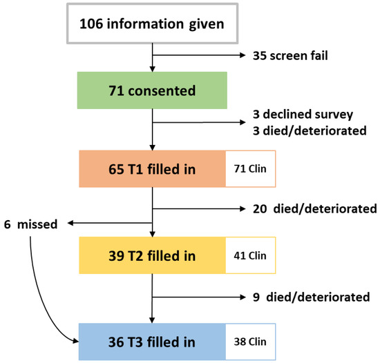 The study was opened in May 2018, closed in May 2019, and follow up was completed in August 2019. During the one-year recruitment period, 106 patients were approached, 35 declined study entry or decided not to start chemotherapy. Full accrual and each patient’s length on study are illustrated in Figure A1 and in the CONSORT diagram in Figure 2. Twelve clinician participants were eligible and all consented.