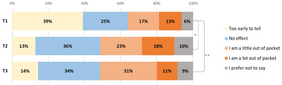 Changes in the financial impact of diagnosis or treatment on patients between T1, T2 (* p = 0.036) and T3 (** p = 0.034).