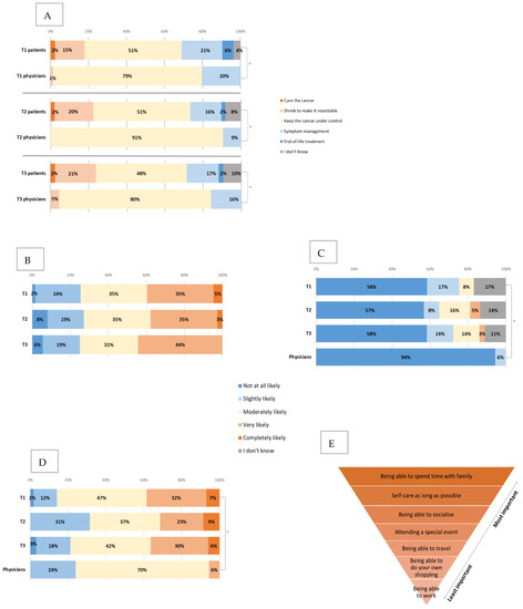 Expectations and priorities for treatment. (A) Changes in the patient and physician views about aims of treatment between T1, T2 and T3. * all p < 0.001 (B) Changes in the patients’ views about the likelihood of chemotherapy reducing their current symptoms between T1, T2 and T3. (C) Changes in the patients’ views about the likelihood of the treatment to cure the cancer between T1, T2 and T3 (compared to physician baseline views). * p = 0.02. (D) Changes in the patients’ views about the likelihood of the cancer to respond to chemotherapy between T1, T2 and T3 (compared to physician baseline views). * p=0.001. (E) Patients priorities ranked from most important (nr 1) to least (nr 7) important (baseline).