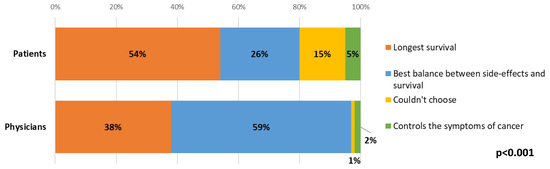 Compared to clinicians, there was a statistically significant difference (p < 0.001) in the answers to this question, where all (100%) of clinicians responded that the goal of treatment was to control the cancer and manage symptoms. There was no significant change between the time points in patient or clinician views.