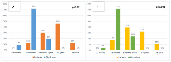 Comparison between patient and clinician expectations: (A) About chemotherapy extending patient survival at baseline (p < 0.001). (B) About minimal extra survival time that would be important to patients at baseline (p < 0.001).