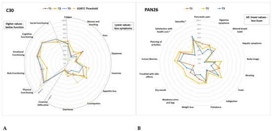 (A) Average QLQ-C30 scale scores at T1, T2, T3 compared to the EORTC Threshold for clinical importance. (B) Average PAN26 scale scores at T1, T2, T3. Details of the values and changes between time points are described in Table 2. *: function scales were switched for all scales to have the same direction.