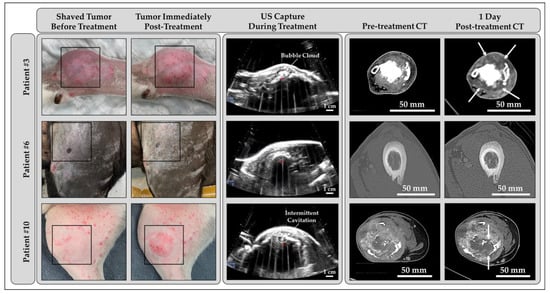 Example photographs of OS tumors (left—boxed), US captures during treatment (center), and pre- and post-histotripsy contrast-enhanced CT scans of patient tumors (right). The treated tumors varied radiographically and grossly, influencing bubble cloud visibility on B-mode US. Cavitation bubble clouds were most visible when histotripsy was applied to tumors composed of lytic bone and a soft tissue component and least visible in cases of proliferative bone or an intact bony matrix. Following histotripsy treatment, CT scans from all but one patient (Patient #6) showed a decrease in enhancement in the treated region (arrows). Patient #10 had underlying dermatitis prior to histotripsy treatment.