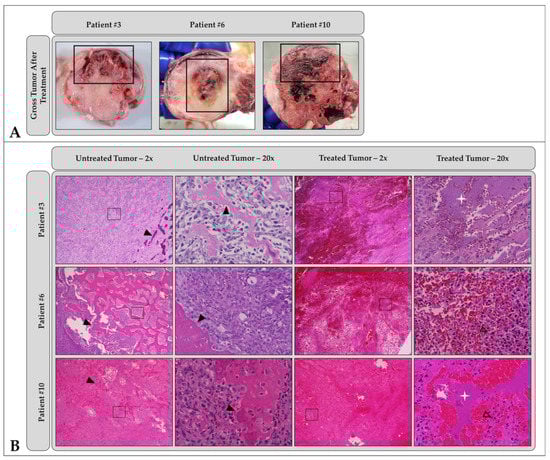 Patient-matched (A) gross pathology and (B) low- (2×) and high-magnification (20×) microscopic histology images comparing treated and untreated OS tumor regions. In all patients shown, histotripsy-treated regions of the tumor (thick black boxes in (A)) were characterized by hemorrhage, tissue softening, and/or necrosis. Sections from untreated areas of OS tumors showed dense proliferation of neoplastic osteoblasts variably surrounding the osteoid matrix (black arrowheads). In contrast, sections from treated tumors exhibited hemorrhage and necrosis, abundant cell death (empty arrowheads identify dead or dying cells), complete tissue obliteration with replacement basophilic slipping (white star), and/or matrix degeneration (not shown). Patient-specific ablation details can be found in Table 5. Images in columns 2 and 4 of (B) were taken from boxed regions in columns 1 and 3, respectively.