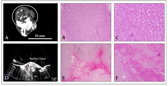 Representative images of chondrosarcoma histotripsy treatment (Patient #9). (A) Pre-treatment CT scan with tumor circled. (B,C) Untreated tumor tissue showing neoplastic chondroblasts surrounded by chondroid matrix (B: magnification—4×; C: magnification—20×). (D) Histotripsy bubble cloud on US imaging during treatment. (E,F) Treated tumor tissue exhibiting acute hemorrhage, a mixture of dead or dying cells, and degeneration of the chondroid matrix (white star) (E: magnification—2×; F: magnification—20×).