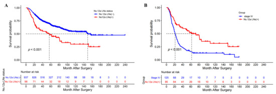 (A) The overall survival curves of patients with and without No. 12a LN metastasis after a D2 gastrectomy; (B) The overall survival curves of patients with No. 12a LN metastasis (stage IV not included) and patients with stage IV after D2 gastrectomy.