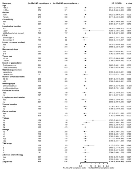 Subgroup analysis was performed in the matched cohort according to clinicopathologic parameters. It showed that compliance with No. 12a LND could bring a survival benefit for most subgroups, especially for patients with tumors involving the middle/lower third of the stomach (p = 0.012), with EGJA Siewert type III (p = 0.034), who had a tumor with or without lesser curvature involvement (both p < 0.05), who underwent distal gastrectomy (p = 0.010), who had a tumor size of <5 and ≥5 cm (both p < 0.05), with pT3 (p = 0.001) and pT4 (p = 0.005), with pN3a (p = 0.048), with stage II (p = 0.007) and stage III (p = 0.002), and who received adjuvant chemotherapy (p = 0.004). The detailed results of the subgroup analysis are depicted in a forest plot (Figure 3).