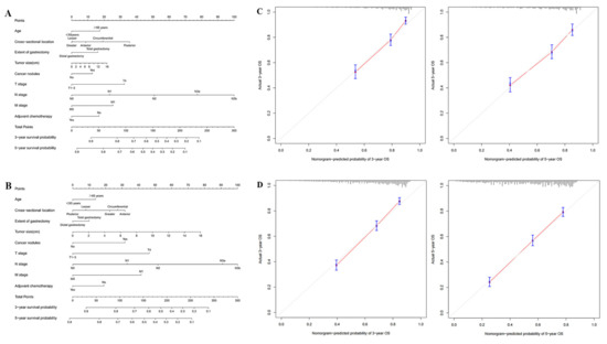 (A) Nomogram of No. 12a LND compliant patients; (B) Nomogram of No. 12a LND noncompliant patients; (C) Calibration curves for nomogram of No. 12a LND compliant patients; (D) Calibration curves for nomogram of No. 12a LND noncompliant patients.