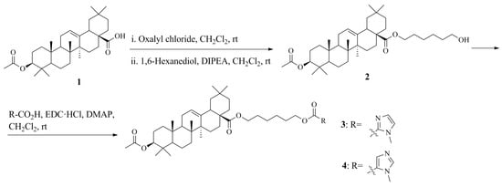 To a solution of 6-hydroxyhexyl (3β)-3-(acetyloxy)olean-12-en-28-oate 2 (0.40 g, 0.70 mmol) in anhydrous dichloromethane (20 mL) was added the 1-methyl-1H-imidazole-2-carboxylic acid (or 1-methyl-1H-imidazole-5-carboxylic acid) (0.13 g, 1.10 mmol) followed by N-[3-(methylamino)propyl]-N’-ethylcarbodiimide hydrochloride (EDC·HCl) (0.21 g, 1.10 mmol) and 4-dimethylaminopyridine (DMAP) (43 mg, 0.35 mmol) under argon. The mixture was stirred at room temperature overnight. The mixture was diluted with H2O (10 mL) and the CH2Cl2 layer was separated, dried over MgSO4 and concentrated. The crude product was purified by column chromatography (silica gel) using hexane/EtOAc = 1/2 as the elution solvent to afford imidazole derivatives of oleanolic acid 3 or 4.