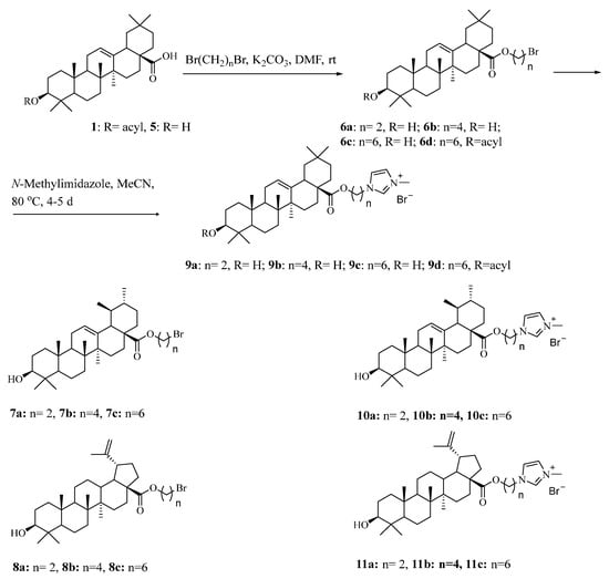 To a solution of bromoalkane derivative of triterpenoid 6a–6d (or 7a–7c, 8a–8c) (1 mmol) in dry MeCN was added N-methylimidazole (1 mmol, 82 mg) under argon. After stirring at 80 °C for 4–5 days, the solvent was evaporated. The residue was purified by column chromatography to obtain the corresponding product 9a–9d (or 10a–10c, 11a–11c) using hexane/EtOAc (1/1) as the elution solvent; then, CHCl3/MeOH (10/1) was used.