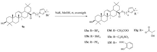 1-Alkyl-3-methylimidazolium (3β)-3-hydroxyurs-12-en-28-oate (16a–16d) and 1-alkyl-3-methylimidazolium (3β)-3-hydroxylup-20(29)-en-28-oate (17a–17d) were prepared with a similar procedure.