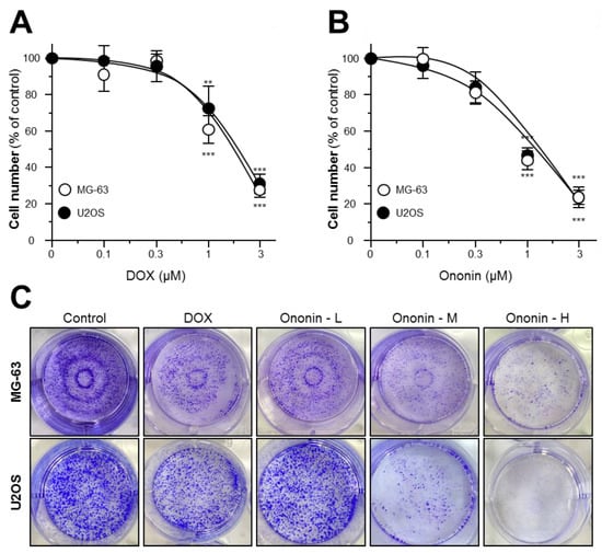 Cultured cells were treated with (A) DOX (0.1–3 μM) or (B) ononin (0.1–3 μM) for 48 h. The cell viability was determined by the MTT assay. Data are presented as a percentage change from the control group and in Mean ± SEM, with n = 6. Statistical changes were clustered as significant *** where p < 0.001 as compared with the control group. (C) Cells were seeded into 6-well plate, and after 48 h of treatment, cells were treated with fresh DMEM for another 7 days. Ononin at 0.1 μM was labeled as -L, 0.3 μM was highlighted as m and 1 μM was shown as -H, respectively. Crystal violet was used to stain the colony formation assay.