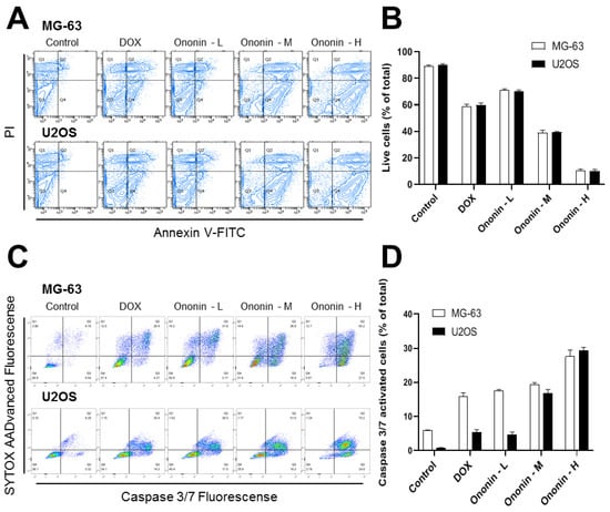 In addition to the MTT and colony formation assays, the induction of cell apoptosis was studied in both MG-63 and U2OS cells treated with 1 μM DOX or different concentrations of ononin (Figure 2A,B). Flow cytometry was used to examine Annexin V-FITC- and PI-labeled MG-63 or U2OS cells, which exhibited apoptosis after DOX therapy. DOX at 1 μM showed a significantly increased apoptosis rate as compared to the control group on MG-63 or U2OS cells (Figure 2A,B). Furthermore, a succession of ononin treatments boosted the rate of cell death, as reflected by a flow cytometer. The data were congruent with caspase 3/7 results, which were dose-dependently increased after 48 h of ononin treatment as indicated by flow cytometry (Figure 2C,D).