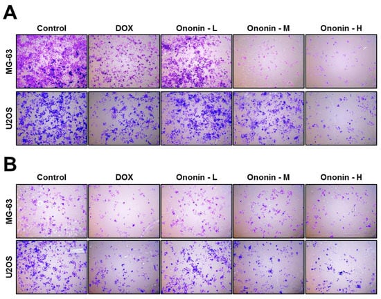 We used a matrix gel-coated transwell test for detecting the anti-migration and anti-invasive capacity of ononin on MG-63 or U2OS osteosarcoma cells (Figure 3). After 48 h of incubating ononin with MG-63 and U2OS, the cell’s migratory function was suppressed dose-dependently (Figure 3A). The cell attachment to the bottom layer was significantly reduced following 1 μM ononin treatment (Figure 3A). Similarly, the invasion functions of osteosarcoma cells were significantly decreased after 48 h of treatment with ononin, which was determined by the Matrix gel-coated transwell test (Figure 3B). The crystal violet staining of invading cells was identified in the bottom layer shown in purple (Figure 3B).