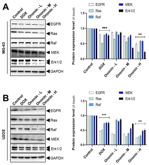 Osteosarcoma cells express markedly distinct levels of functional EGFR, which is well-recognized by EGF-mediated downstream cascade activation of Ras, Raf, MEK, and Erk [22]. We used SDS-PAGE to investigate the precise mechanism of this bioactive compound for the treatment of osteosarcoma. Ononin suppressed the cascade expressions of EGFR, Ras, Raf, MEK, and Erk1/2 proteins in a dose dependent manner. Furthermore, the results demonstrated that ononin at 1 μM had the greatest effective concentration for blocking target gene expression on MG-63 or U2OS cells (Figure 4). Similarly, treatment with DOX at 1 μM (as a positive control) significantly inhibited the cascading mechanism of EGFR, Ras, Raf, MEK, and Erk1/2 expressions with significant differences when compared to the control (Figure 4).