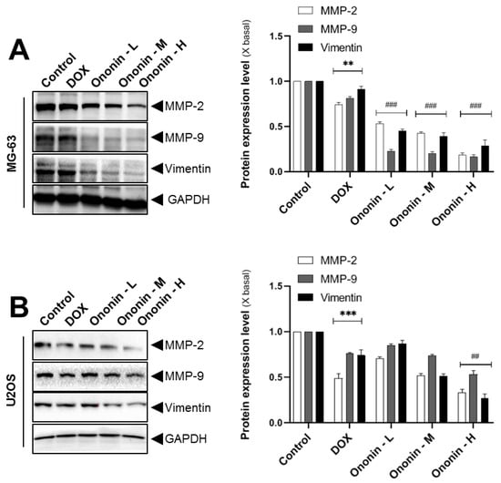 In many cancers, MMP2/9 performs an active role in cell proliferation, invasion, and tumor metastasis. In osteosarcoma tissues, MMP-2/9 contributes to the invasion of endothelial cells by destroying extracellular collagen [23,24]. In the present study, we also found that the metastasis-related biomarkers MMP-2/9 and vimentin were significantly reduced after treatment with ononin. The blotting data showed that after 48 h of incubation with ononin on MG-63 and U2OS cells, the activities of MMP-2, MMP-9, and vimentin were significantly reduced (Figure 5). A series of concentrations of ononin blocked the expression levels of MMP-2, MMP-9, and vimentin at varied levels, as shown in Figure 5. The results of SDS-PAGE revealed that the most effective dose of ononin for the anti-metastatic effect was 1 μM.