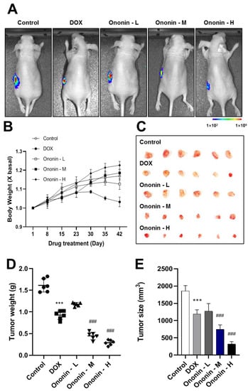 (A) Representative bioluminescence imaging of nude mice xenograft tumor after 42 days of treatment. The control group received PBS; the DOX group received DOX (2 mg/kg/i.p); the ononin group received different amounts of ononin (1, 3, and 10 mg/kg/i.p). (B) The mice’s body weight was recorded during the 42-day investigation. (C) On day 42, tumors were removed from mice. (D) After the studies, the tumor weight was calculated. (E) On day 42, the tumor size was calculated. The data were reported as Mean SEM, with n = 6. *** p < 0.001 was considered a significant result as compared to the control group; ### p < 0.001 was considered a significant result as compared to the DOX group.