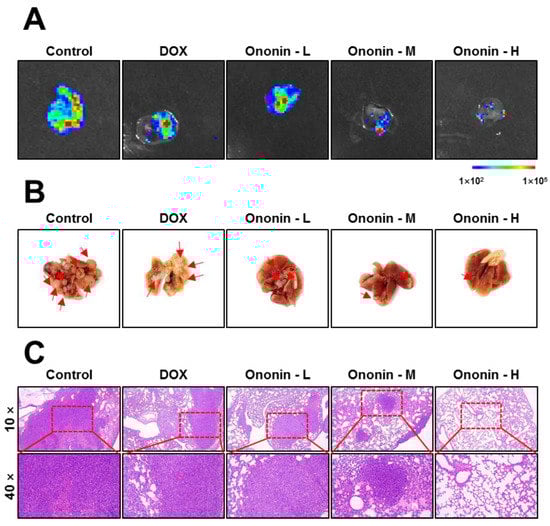 (A) Bioluminescence imaging of the separated lungs from each group of MG-63 xenograft nude mice. (B) Images of lungs from various groups and treatments. (C) The lung has been stained with HE. Ononin at 1, 3, and 10 mg/kg/i.p were shown as -L, -M, and -H, respectively.