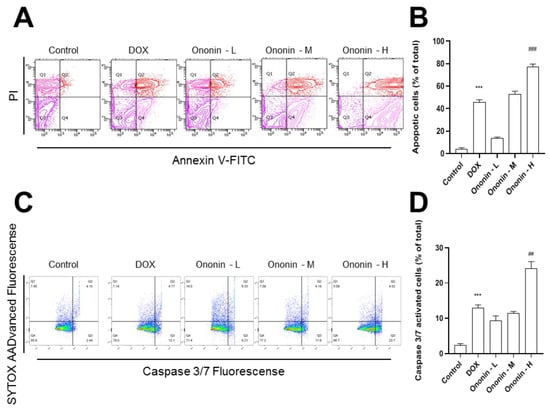 (A) The viable cell population was displayed in the bottom left quadrant, the early apoptotic cells in the bottom right quadrant, and the late apoptotic cells in the top right quadrant of the dual parametric dot plots integrating annexin V-FITC and PI fluorescence. (B) The quantification analysis was analyzed by the program Flowjo v7.6. (C) The dual parametric dot plots combining caspase 3/7 and SYTOX AADvanced fluorescence showed activated caspase 3/7 in the bottom right quadrant (Q4). (D) The quantification analysis was conducted by the program Flowjo v7.6. Ononin at 0.1 μM was labeled as -L, 0.3 μM was highlighted as -M, and 1 μM was shown as -H. The values are expressed as the percentage of total cell number, n = 6, in Mean ± SEM. DOX (1 μM) was applied as a positive control.