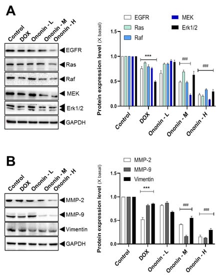 The homogenized tumor cell was subjected to SDS-PAGE for determining the target genes (A,B) translational functions. GAPDH was used as a loading control. The quantification of the target protein was calculated with a densitometer (right panel). The values are expressed as the fold of changes (X basal), in Mean ± SEM, where n = 6. Ononin at 1, 3, and 10 mg/kg/i.p were shown as -L, -M, and -H, respectively. *** p < 0.001 was considered a significant result as compared with the control, and ### p < 0.001 was considered a significant result as compared with the DOX group. Full Western blot images can be found at Supplementary Materials.