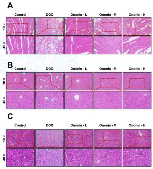 In this study, the effects of ononin on inhibiting osteosarcoma cell proliferation and metastasis have been demonstrated in vitro and in vivo. Specifically, it is essential to determine whether ononin is toxic in vivo or not. During the animal experiments, there were no signs of pain or toxicity after ononin treatment, and all of the experimental mice survived up to 42 days after treatment. The H and E staining technique was used to exhibit the various organs obtained from the various treatment groups (ononin and DOX) in Figure 10. There were no visible tissue lesions found in the histological specimens obtained from the ononin experimental groups (Figure 10). Likewise, there was no significant evidence of cardiac fibrosis, liver inflammation, and glomerular or tubular changes in the kidneys (Figure 10). However, mice treated with DOX showed significant morphological changes in the shape of their hearts, livers, and kidneys when compared to the control group (Figure 10). Furthermore, we determined the ALT and AST levels in each group of animals to provide more biosafety data after ononin treatment, and the results showed that the ALT and AST contents were not altered after 42 days of ononin treatment (Figure 11). DOX, on the other hand, was capable of increasing ALT and AST levels (Figure 11). Thus, based on in vitro and in vivo studies, ononin could be the safe agent for reducing the proliferation and metastasis of osteosarcoma.