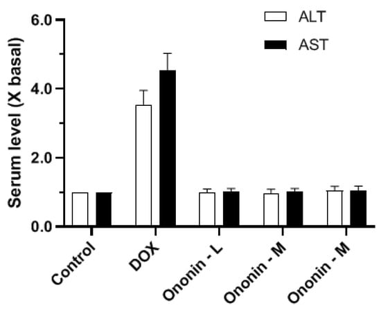 Biochemical index of animals after ononin treatment. The levels of ALT and/or AST in different groups were determined, and values are expressed as the fold of changes (X basal), in Mean ± SEM, with n = 6.