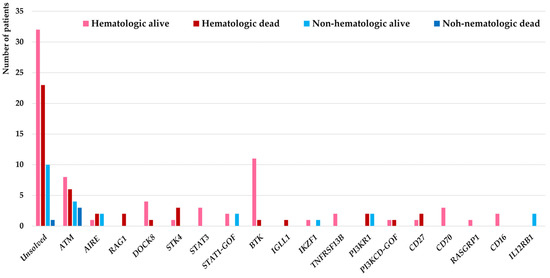 Molecular pathogenesis of 144 IEI patients associated with hematologic and non-hematologic malignancies and their impact on the mortality of patients.