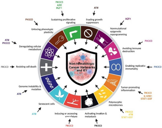 IEI can lead to increased morbidity and mortality in affected cases [6]. Malignancies have been reported as one of the leading mortality causes associated with IEI, especially due to hematological cancers when infectious complications of these patients can be managed adequately [2,7]. Since IEIs are very uncommon, it is very difficult to establish the exact molecular background of malignancies correlated with cancers. Nonetheless, the development of cancers has been reported in less than one-fourth of IEI patients and it is estimated that a minority of patients can present solid non-hematologic tumors [8]. The most important reported mechanism of malignancy is avoiding immune destruction (defective tumor immune surveillance to detect and eliminate nascent transformed cells) [9,10]. However, almost all other cancer hallmarks are commonly associated with IEI including genome instability, and mutation, enabling replicative immortality, tumor-promoting inflammation, resisting cell death, sustaining proliferative signaling, evading growth suppressors, deregulating cellular energetics, inducing angiogenesis, activating invasion and metastasis, unlocking phenotypic plasticity, senescent cells, non-mutational epigenetic reprogramming, and polymorphic microbiomes [9,11].