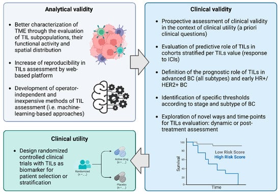 Next steps in clinical validity assessment require the definition of a threshold for each BC subtype, a better characterization of TILs’ prognostic role in early HR+/HER2- BC, the definition of the prognostic value of TILs in advanced disease, and, lastly, the assessment of the predictive role of response to IO agents across all subtypes and all stages. All these issues require prospective validation in cohorts stratified according to TILs’ value.