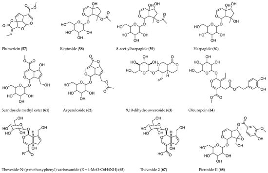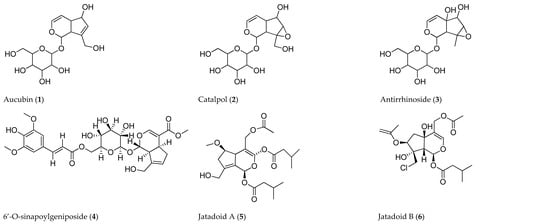 - Viljoen, A.; Mncwangi, N.; Vermaak, I. Anti-Inflammatory Iridoids of Botanical Origin. Curr. Med. Chem. 2012, 19, 2104–2127. [Google Scholar] [CrossRef] [PubMed]