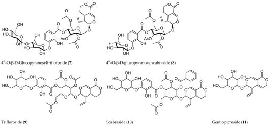 - Kim, J.A.; Son, N.S.; Son, J.K.; Jahng, Y.; Chang, H.W.; Jang, T.S.; Na, M.; Lee, S.H. Two New Secoiridoid Glycosides from the Rhizomes of Gentiana Scabra Bunge. Arch. Pharm. Res. 2009, 32, 863–867. [Google Scholar] [CrossRef] [PubMed]