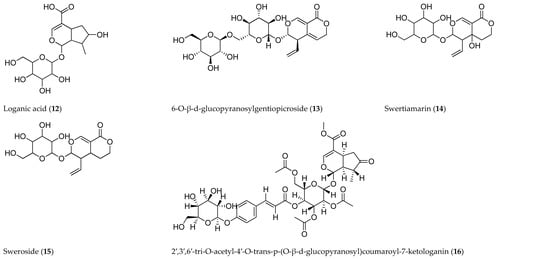 - Dinda, B.; Roy Chowdhury, D.; Mohanta, B.C. Naturally Occurring Iridoids, Secoiridoids and Their Bioactivity. An Updated Review, Part 3. Chem. Pharm. Bull. 2009, 57, 765–796. [Google Scholar] [CrossRef]
