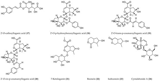Recently, more advanced and intricate methods have been developed, and these include droplet counter-current chromatography (DCCC), high-speed counter-current chromatography (HSCCC), gas–liquid chromatography (GLC), and capillary zone electrophoresis (CZE) [70,76]. Wu et al. (2009) identified 11 iridoids in which 5 derivatives were unreported, and these were 2,3,6-tri-O-acetyl-40-O-trans-p-(O-b-D-glucopyranosyl)coumaroyl-7-ketologanin (16), 2′-O-caffeoylloganic acid (17),2-O-p-hydroxybenzoylloganic acid (18), 2-O-trans-p-coumaroylloganic acid (19), and 2-O-cis-p-coumaroylloganic acid (20) isolated from whole plants of Gentiana loureirii. The six known iridoids were 7-ketologanin (21), loganic acid (12), sweroside (15), boonein (22), and isoboonein (23), which were isolated with three other known compounds. To successfully isolate iridoids, combined chromatography techniques, including silica gel and octadecylsilyl (ODS) CC, were used, while spectroscopic techniques, such as 2D NMR, were used in structural elucidation [77].