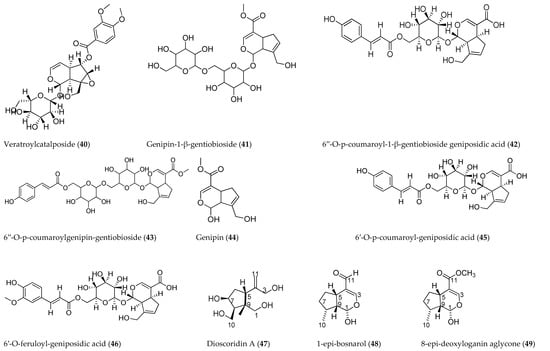 - Dinda, B. Pharmacology and Application of Naturally Occuring Iridoids; Springer International Publishing: Berlin/Heidelberg, Germany, 2019; ISBN 9783030055752. [Google Scholar]