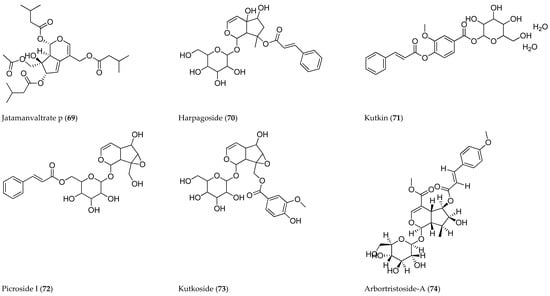 Pandeti et al. (2014) investigated iridoids, namely arbortristoside-A (74) and 7-O-trans-cinnamoyl 6β–hydroxyloganin (75), which were derived from Nyctanthes arbortristis, and reported considerable anticancer activities. In the same study, chemical derivation was conducted, leading to the formation of two derivatives that exhibited an improvement in anticancer activities in HepG2 (human hepatocellular carcinoma) and MCF-7 (breast adenocarcinoma) [92].