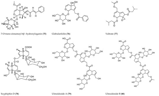 Wang et al. (2019) reported the anticancer activities of globularifolin (76) in SACC-83 cell lines, where the compound had an IC50 of 10 µM and hindered the development of the cell lines. The authors also observed that the cytotoxic effects of globularifolin (76) in healthy HGS cells were very minor, with an IC50 of 80 µM [93]. Another iridoid of interest that has been reported is gentiopicroside (11), which inhibits HeLa cells through multiple ways, including induced apoptosis, cycle arrest, and suppressed migration [94].