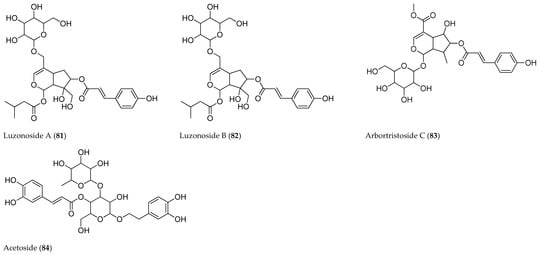 Different findings have been reported regarding the cytotoxicity of iridoids. While a majority seem to be selectively cytotoxic, other iridoids have been observed to be potentially toxic. Fukuyama et al. (2004) isolated iridoids from Viburnum luzonicum. The results of the cytotoxicity assay, which used the HeLa S3 (human epithelial cancer) cell line, demonstrated that two iridoid glucosides, namely luzonoside A (81) and luzonoside B (82) and their aglycons, exhibited moderate inhibitory activity, with IC50 values of 3–7 µM, whereas other isolated compounds showed no cytotoxicity, even at 100 µM [121]. Another in vitro study was conducted on an iridoid isolated from Nyctanthes arbortristi. The in vitro cytotoxic activity of Arbortristoside-C (83) was found to be 100 mg/mL against Hep-2 cells (human epithelial type 2) and was compared with the control culture for each concentration [125]. Another study evaluated the cytotoxicity of acetoside (84) isolated from Cistanche phelypaea on human A431 squamous carcinoma cells and Hacat keratinocytes. The collected data showed that acetonide (84) was not harmful to human keratinocytes at the doses studied, but that it caused minimal cell death in tumor cells (between 12 and 20%) at the concentration of 100 M [122].