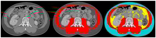 Example body composition analyses. Left image: cross-sectional image at lumbar level L3; middle image: tagged muscle mass (red colour); right image: tagged subcutaneous adipose tissue (blue colour), visceral adipose tissue (yellow colour), intermuscular adipose tissue (green colour) and muscle mass (red colour).