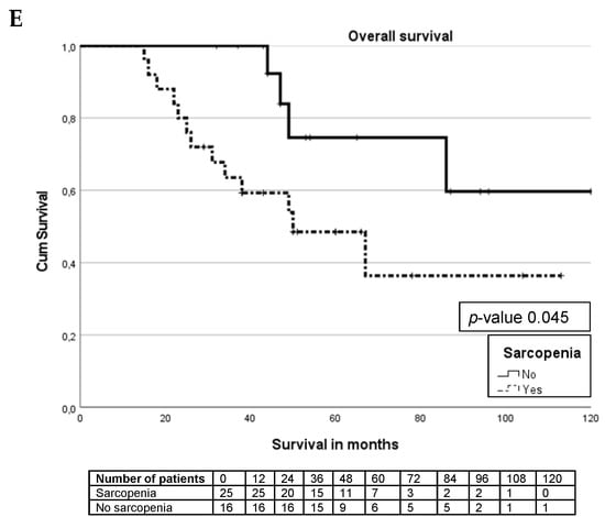 There are no significant differences (p-value 0.39) in overall survival between patients with and without sarcopenia in the whole cohort (Figure 2C). For patients with small bowel NETs, the presence or absence of sarcopenia does not influence the overall survival (p-value 0.49), Figure 2D. In patients with pancreatic NETs, there was a significant (p-value 0.045) survival difference between patients without sarcopenia (median not reached) and patients with sarcopenia (median 50 months, IQR 31–140 months), as seen in Figure 2E.